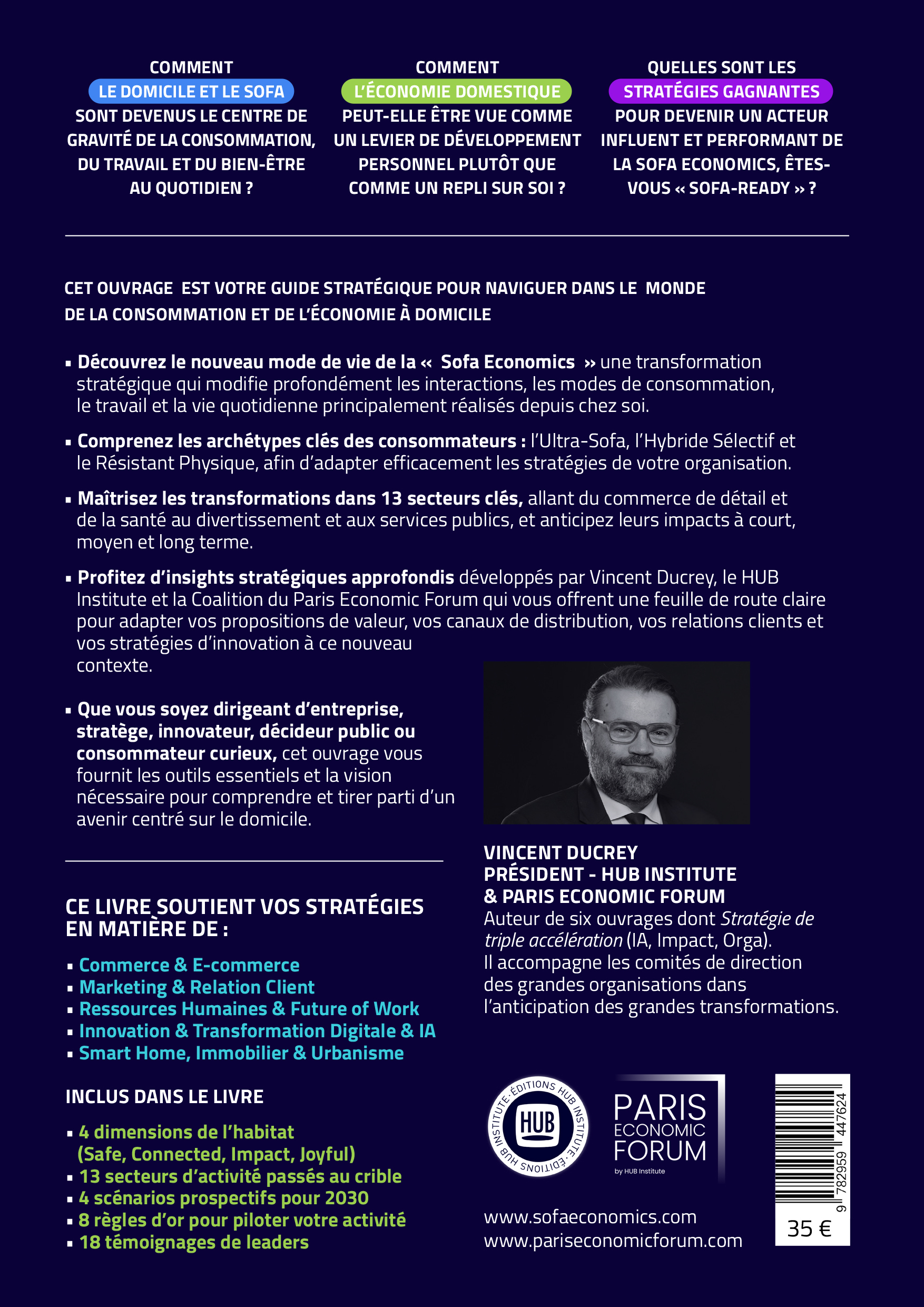 Le livre « SOFA ECONOMICS : Naviguer dans l'économie du domicile » édité par le HUB Institute avec le Paris Economic Forum est une ressource incontournable pour les entreprises et les organisations qui cherchent à prospérer dans un monde où le foyer est devenu le nouveau centre de gravité. Il décrypte l'émergence d'un modèle de vie où l'essentiel des activités humaines - consommation, travail, soin, culture - s'active désormais depuis le canapé.