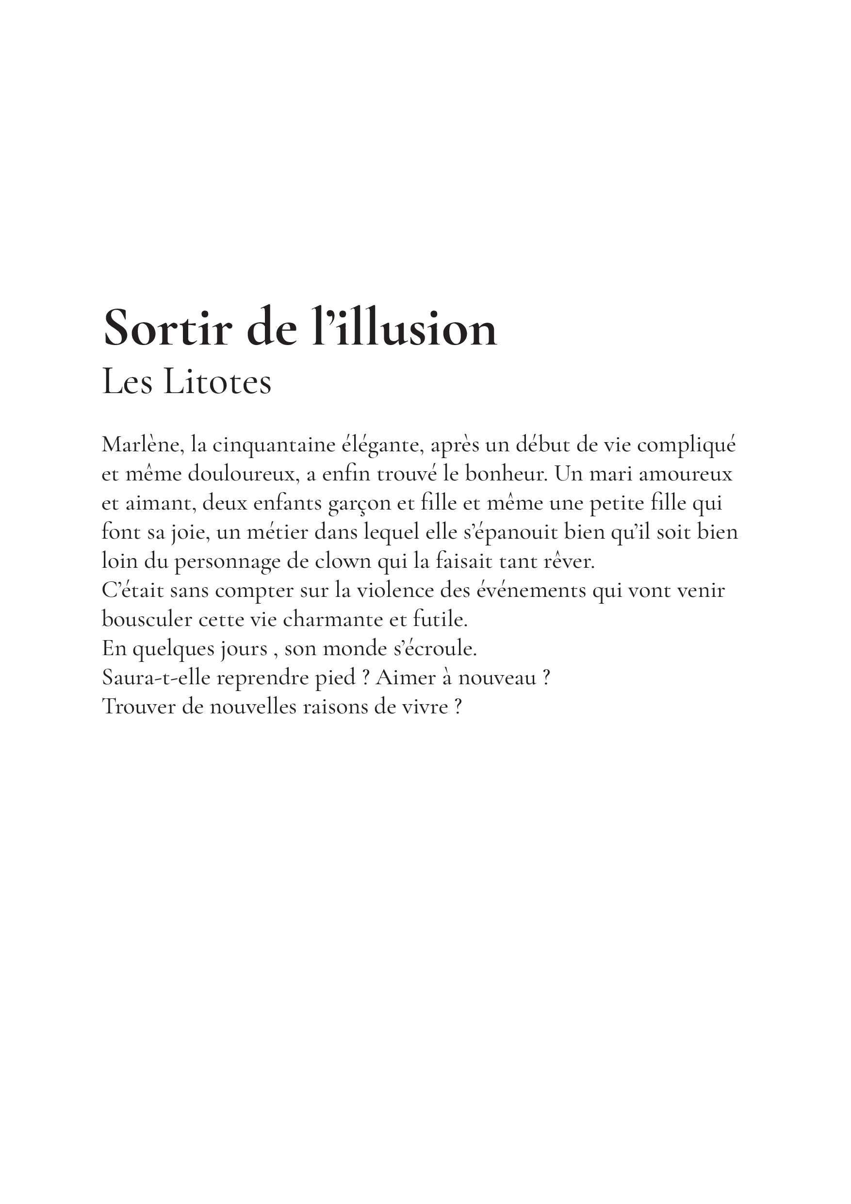 Marlène, la cinquantaine élégante, après un début de vie compliqué et même douloureux, a enfin trouvé le bonheur. Un mari amoureux et aimant, deux enfants garçon et fille et même une petite fille qui font sa joie, un métier dans lequel elle s’épanouit bien qu’il soit bien loin du personnage de clown qui la faisait tant rêver.