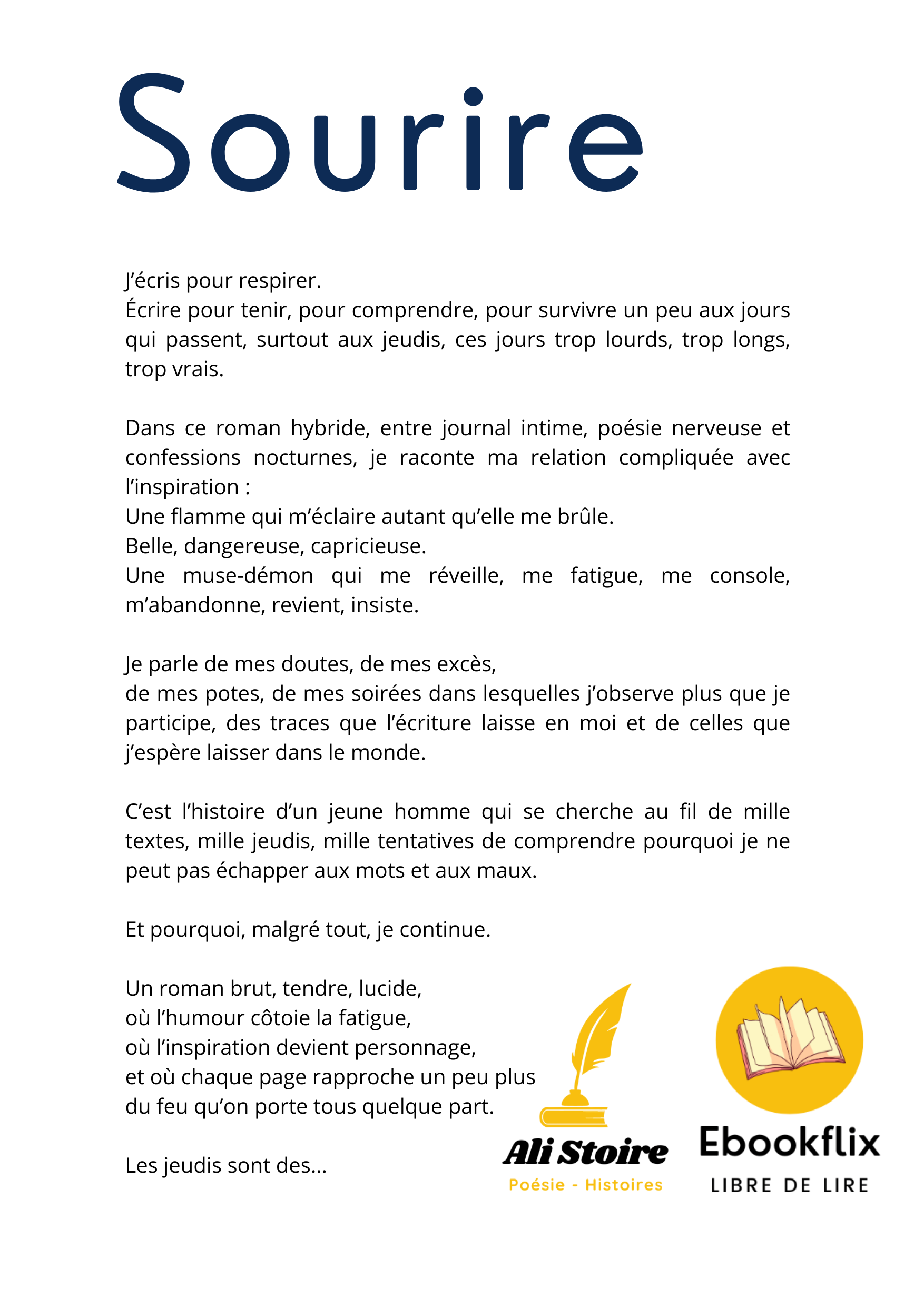 Dans ce roman à la frontière du journal intime, de la poésie et de la confession, je raconte mon lien instable avec l’inspiration : une flamme belle et cruelle, qui éclaire autant qu’elle consume.