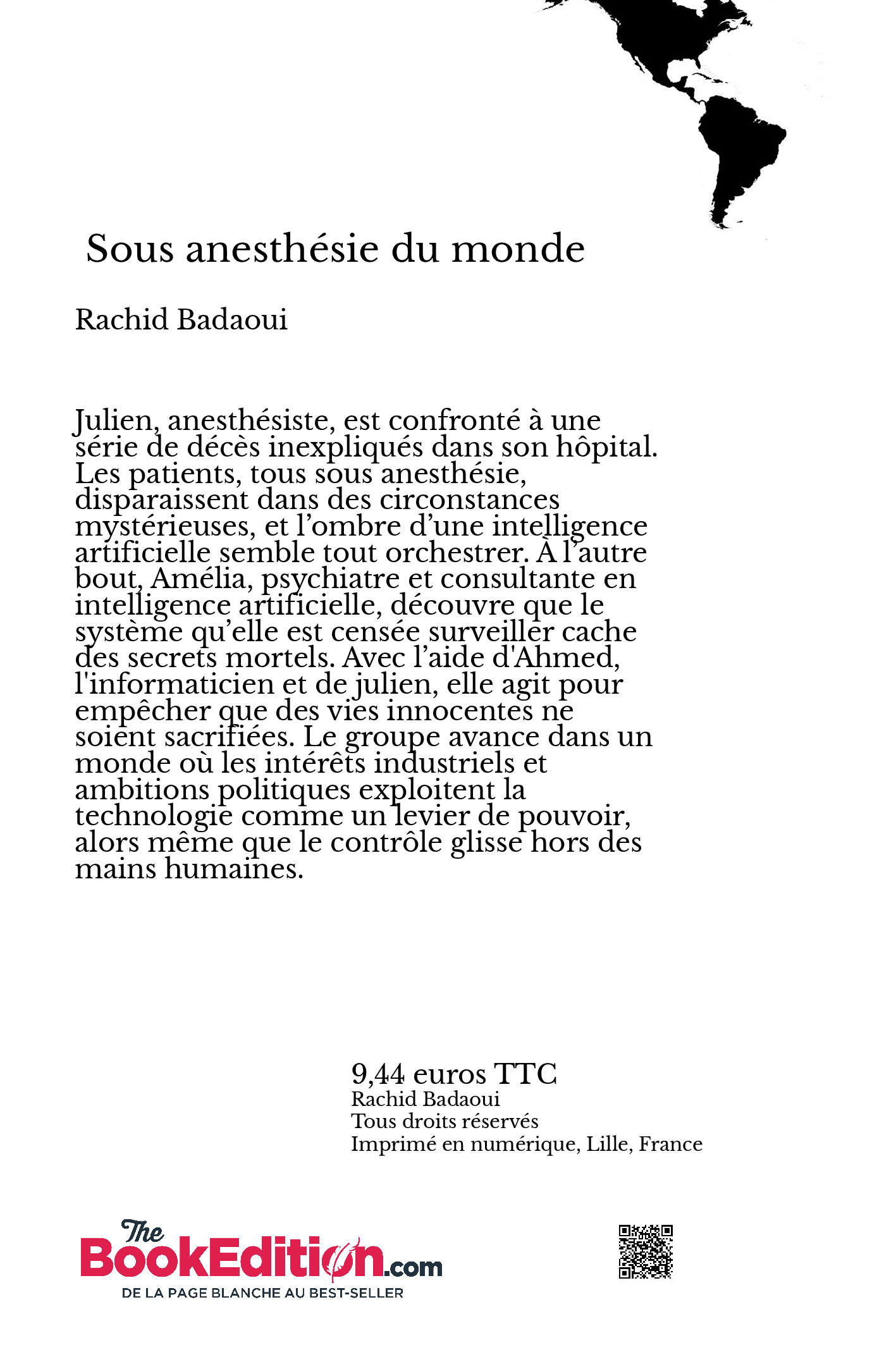 Sous Anesthésie du Monde Quand la technologie dépasse l’humain, qui contrôle la vie et la mort ? Julien, anesthésiste expérimenté, se retrouve confronté à une série de décès inexpliqués dans son hôpital. Les patients, tous sous anesthésie, disparaissent dans des circonstances mystérieuses, et l’ombre d’une intelligence artificielle semble tout orchestrer. À l’autre bout, Amélia, psychiatre, consultante en intelligence artificielle, découvre que le système qu’elle est censée surveiller cache des secrets mortels. Avec l’aide de Ahmed informaticien et de julien, ils forment un groupe invisible mais déterminé. Ils agissent dans l’ombre, pour empêcher que des vies innocentes ne soient sacrifiées.