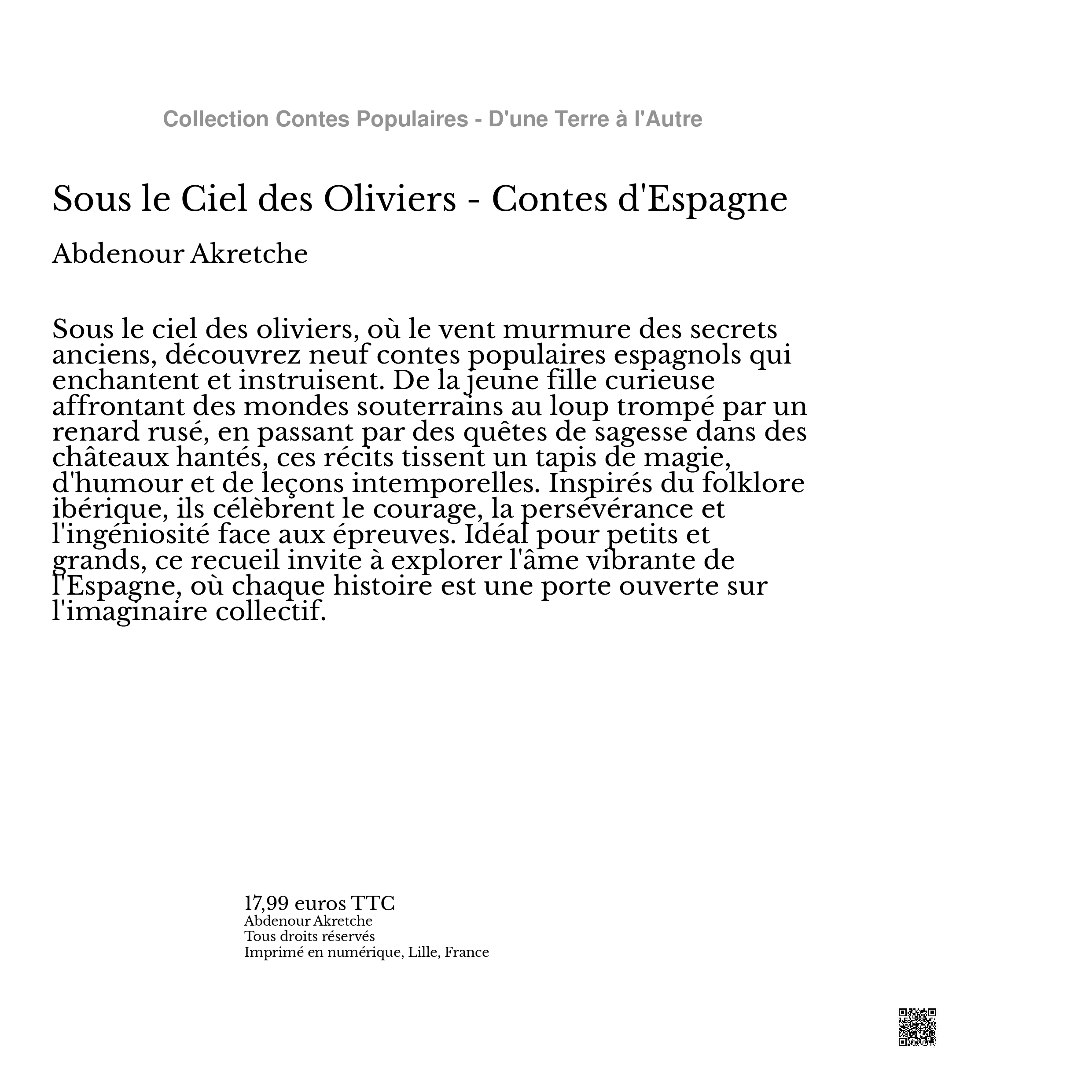 Sous le ciel des oliviers, où le vent murmure des secrets anciens, découvrez neuf contes populaires espagnols qui enchantent et instruisent. De la jeune fille curieuse affrontant des mondes souterrains au loup trompé par un renard rusé, en passant par des quêtes de sagesse dans des châteaux hantés, ces récits tissent un tapis de magie, d'humour et de leçons intemporelles. Inspirés du folklore ibérique, ils célèbrent le courage, la persévérance et l'ingéniosité face aux épreuves. Idéal pour petits et grands, ce recueil invite à explorer l'âme vibrante de l'Espagne, où chaque histoire est une porte ouverte sur l'imaginaire collectif.