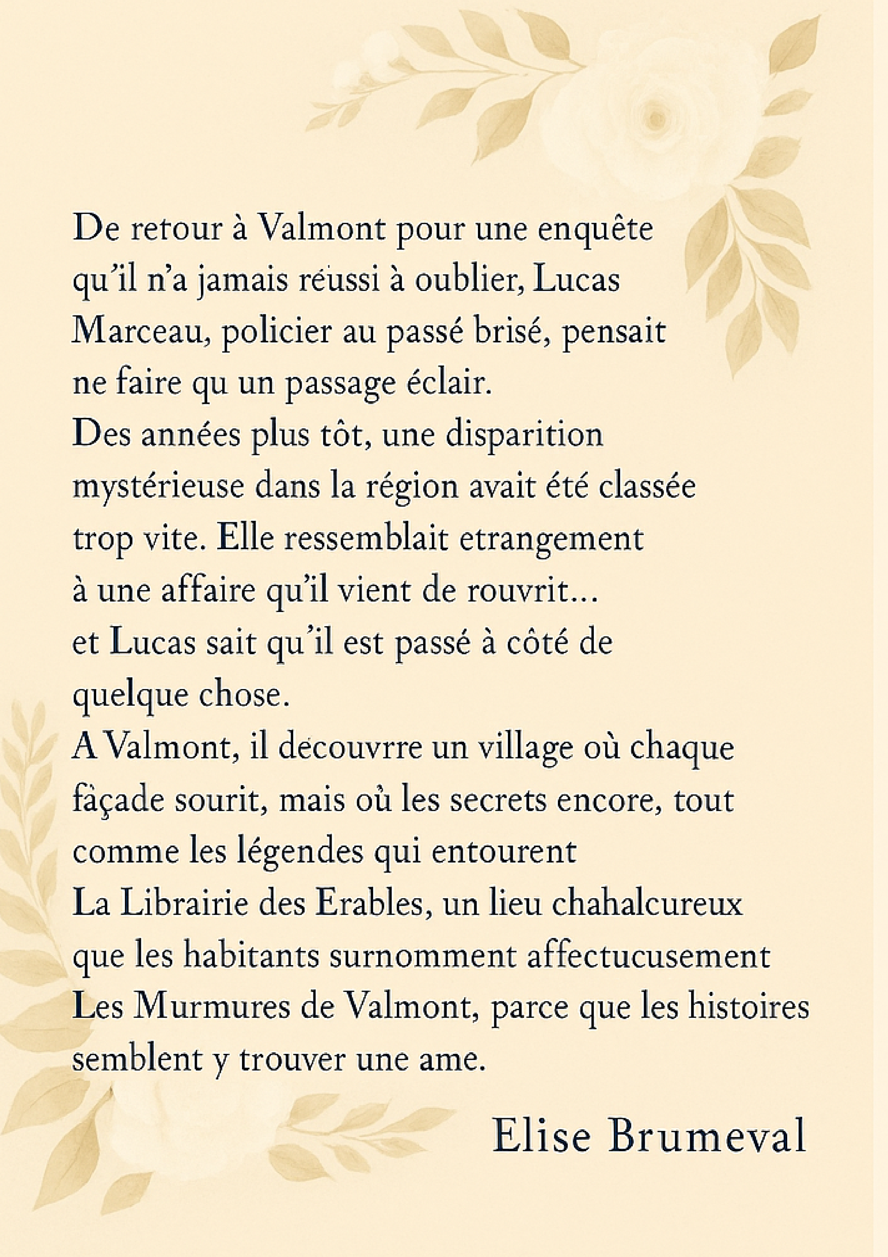 Dans la petite ville de Valmont, Élise Brumeval découvre un carnet ancien évoquant une vérité enfouie. Aux côtés de Lucas, elle se retrouve plongée dans une enquête où archives falsifiées, secrets de famille et menaces silencieuses se mêlent. Quand les secrets des Delmont refont surface, la vérité prend un prix.