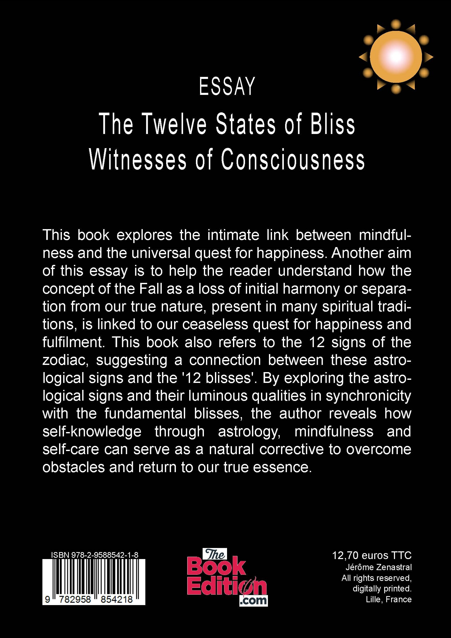 This book explores the link between mindfulness and the quest for happiness. Another aim of this essay is to help the reader understand how the concept of the Fall as a loss of initial harmony or separation from our true nature, present in many spiritual traditions, is linked to our quest for happiness and fulfilment. This book refers to the 12 signs of the zodiac, suggesting a connection between these astrological signs and the '12 blisses'. By exploring the astrological signs and their luminous qualities in synchronicity with the fundamental blisses, the author reveals how self-knowledge through astrology, mindfulness and self-care can serve as a natural corrective to overcome obstacles and return to our true essence.