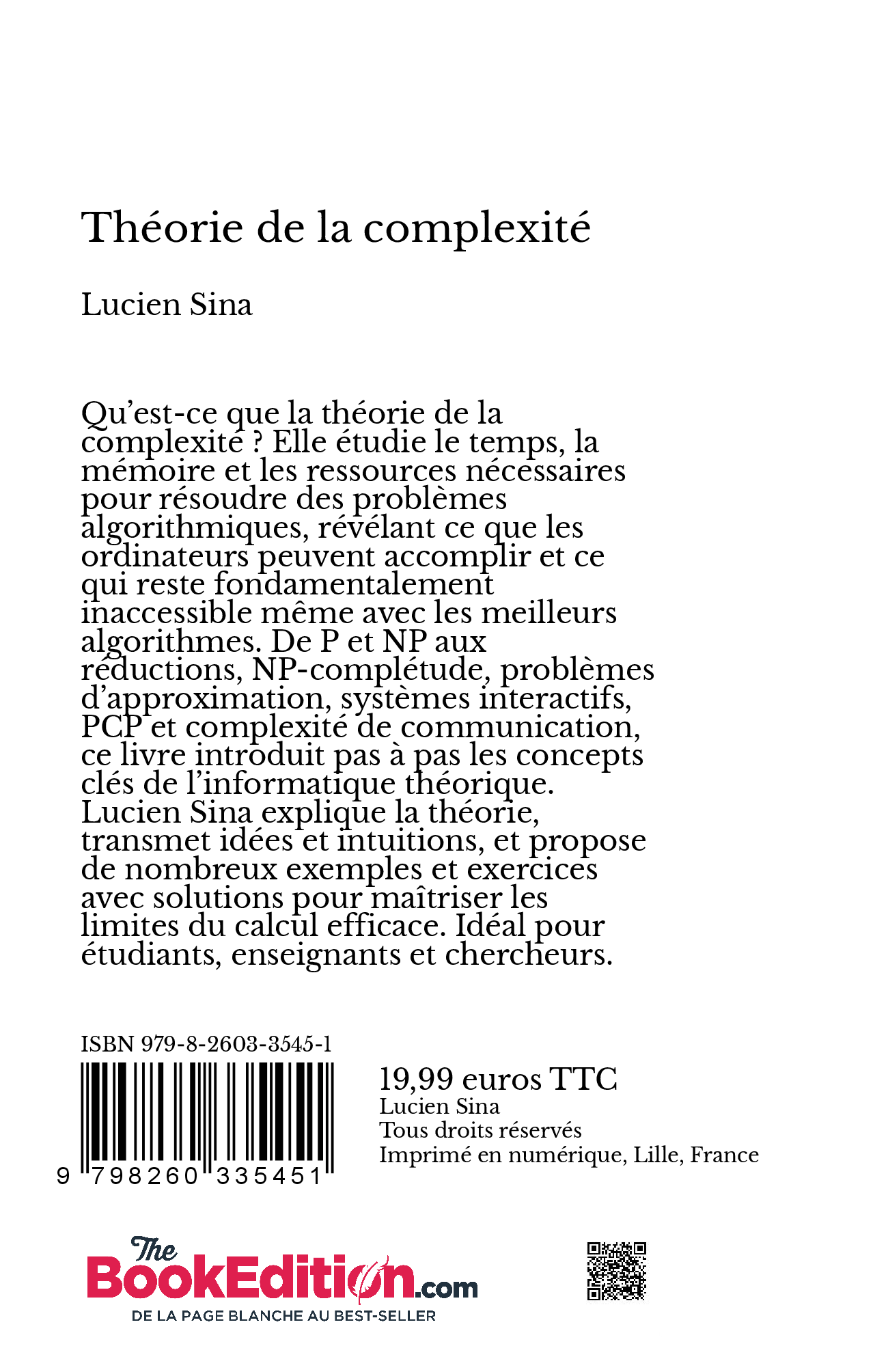 Qu’est-ce que la théorie de la complexité ? Elle étudie le temps, la mémoire et les ressources nécessaires pour résoudre des problèmes algorithmiques, révélant ce que les ordinateurs peuvent accomplir et ce qui reste fondamentalement inaccessible même avec les meilleurs algorithmes. De P et NP aux réductions, NP-complétude, problèmes d’approximation, systèmes interactifs, PCP et complexité de communication, ce livre introduit pas à pas les concepts clés de l’informatique théorique. Lucien Sina explique la théorie, transmet idées et intuitions, et propose de nombreux exemples et exercices avec solutions pour maîtriser les limites du calcul efficace. Idéal pour étudiants, enseignants et chercheurs.