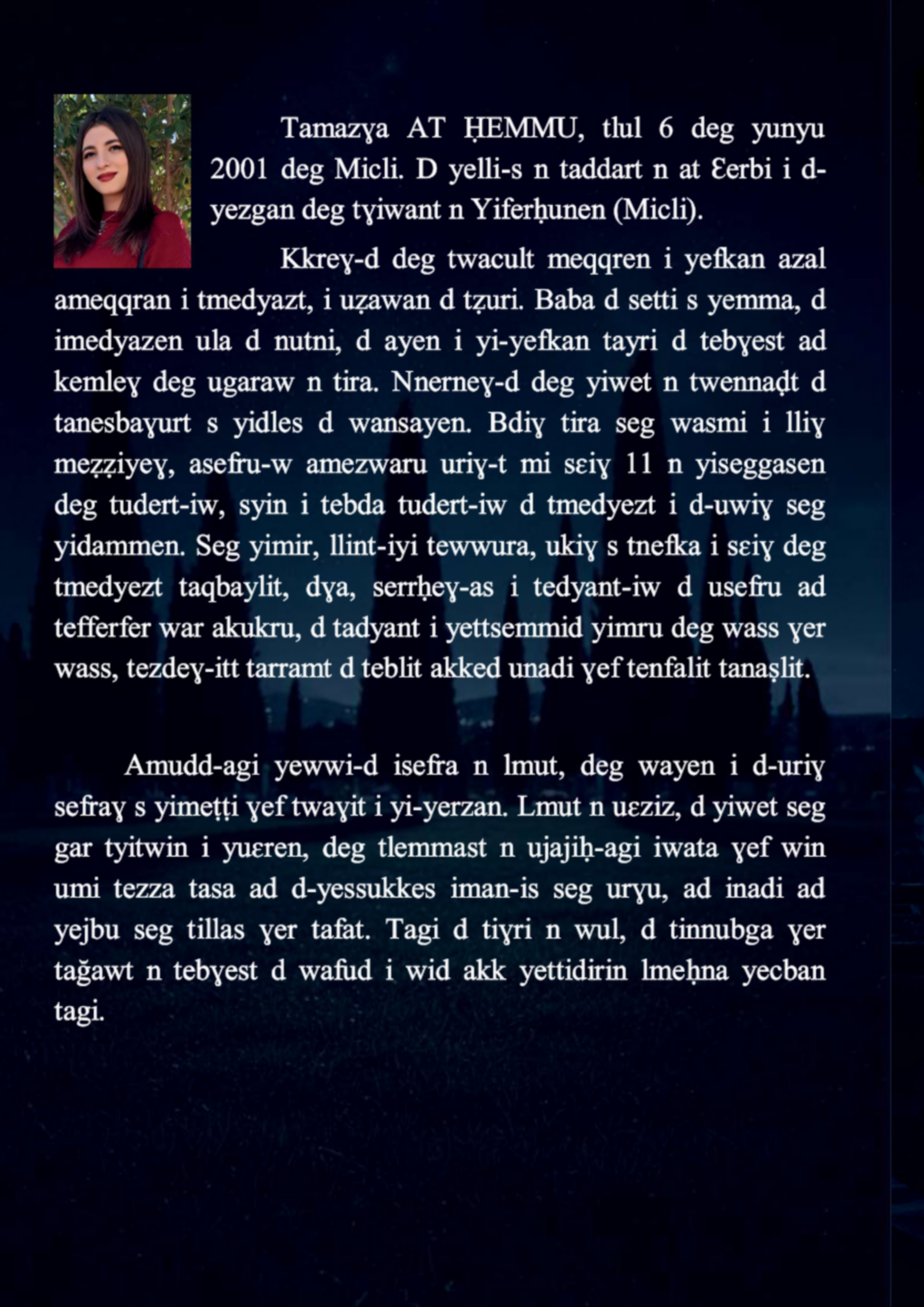 Amudd-agi yewwi-d isefrra n lmut, deg wayen i d-uriɣ sefraɣ s yimeṭṭi ɣef twaɣit i yi-yerzan. Lmut n uεziz, d yiwen seg gar tyitwin i yuεren, deg tlemnast n ujajiḥ-agi iwata ɣef win umi tezza tasa ad d-yessukkes iman-is seg urɣu, ad inadi ad yejbu seg tillas ɣer tafat. Tagi d tiɣri n wul, d tinnubga ɣer taǧawt n tebɣest d wafud i wid akk yettidirin lmeḥna yecban tagi.