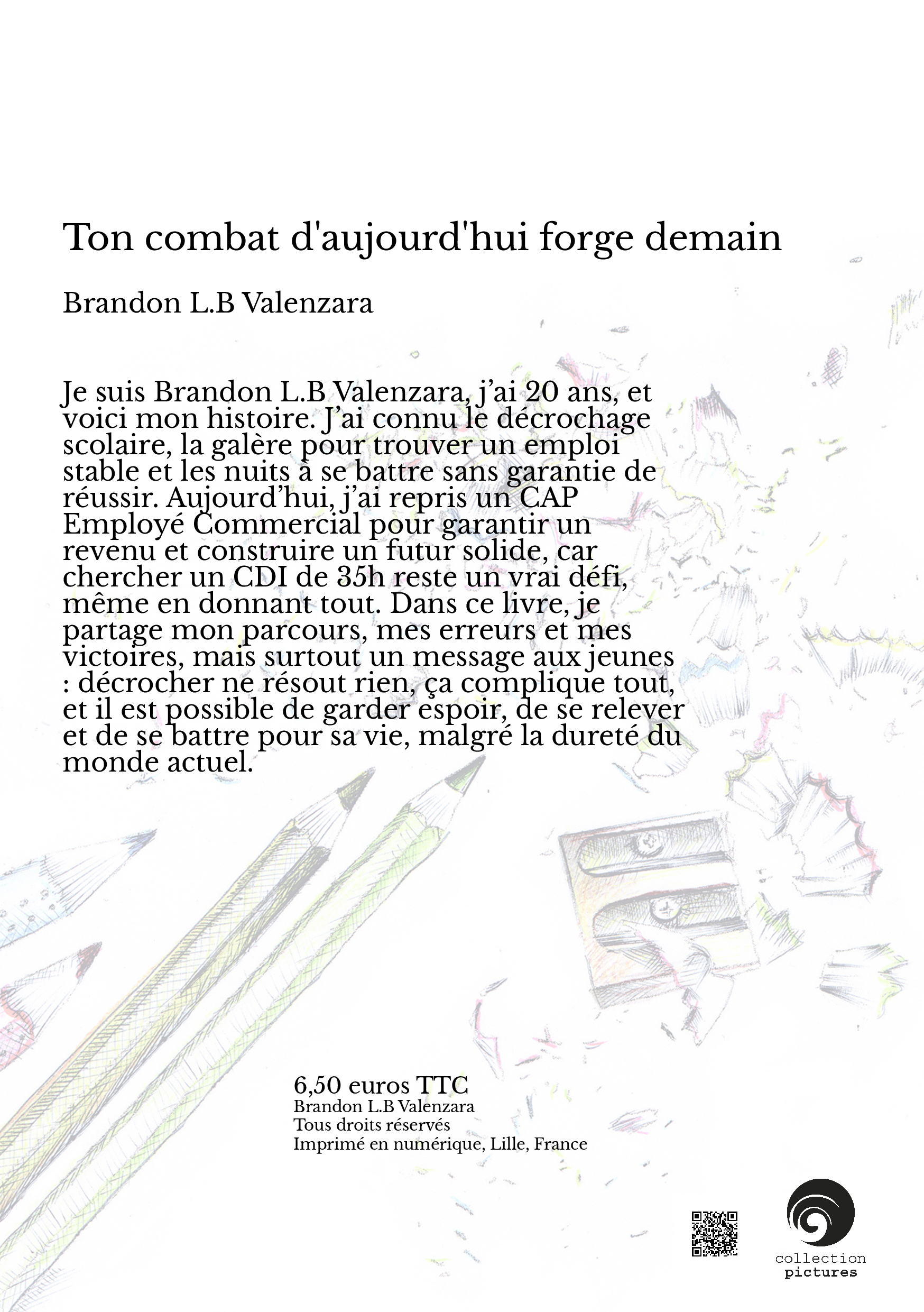 Je suis Brandon L.B Valenzara, j’ai 20 ans, et voici mon histoire. J’ai connu le décrochage scolaire, la galère pour trouver un emploi stable et les nuits à se battre sans garantie de réussir. Aujourd’hui, j’ai repris un CAP Employé Commercial pour garantir un revenu et construire un futur solide, car chercher un CDI de 35h reste un vrai défi, même en donnant tout. Dans ce livre, je partage mon parcours, mes erreurs et mes victoires, mais surtout un message aux jeunes : décrocher ne résout rien, ça complique tout, et il est possible de garder espoir, de se relever et de se battre pour sa vie, malgré la dureté du monde actuel.