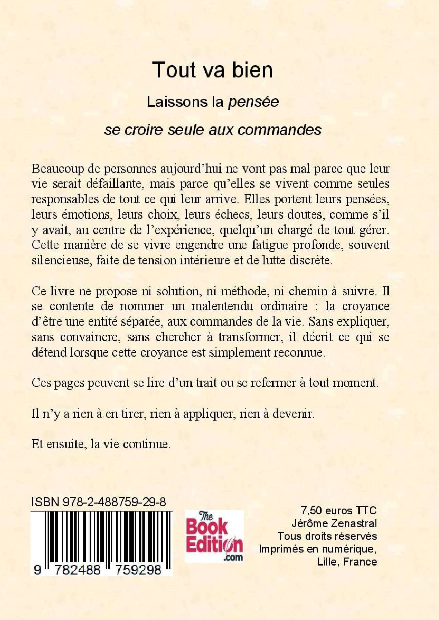 Ce livre ne propose ni solution, ni méthode, ni chemin à suivre. Il se contente de nommer un malentendu ordinaire : la croyance d’être une entité séparée, aux commandes de la vie. Il décrit ce qui se détend lorsque cette croyance est simplement reconnue.