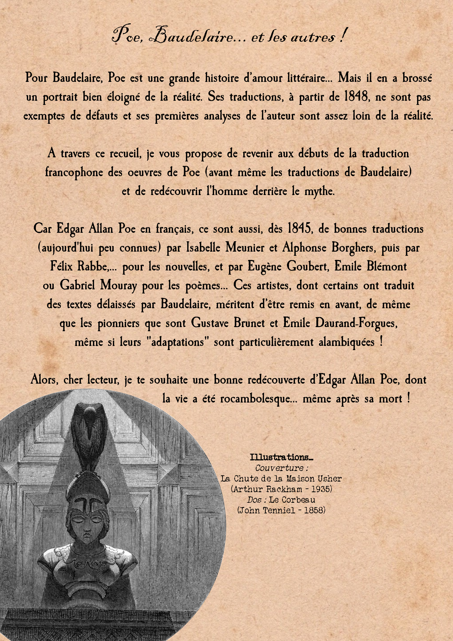 A travers ce recueil, je vous propose de revenir aux tous débuts de la traduction francophone des œuvres de Poe, avec de bonnes traductions, dès 1845, par Isabelle Meunier, Félix Rabbe ou J.-H. Rosny pour les nouvelles, et par Eugène Goubert, Emile Blémont ou Gabriel Mouray pour les poèmes. Ces artistes ont également traduits des textes délaissés par Baudelaire et méritent d’être remis en avant.