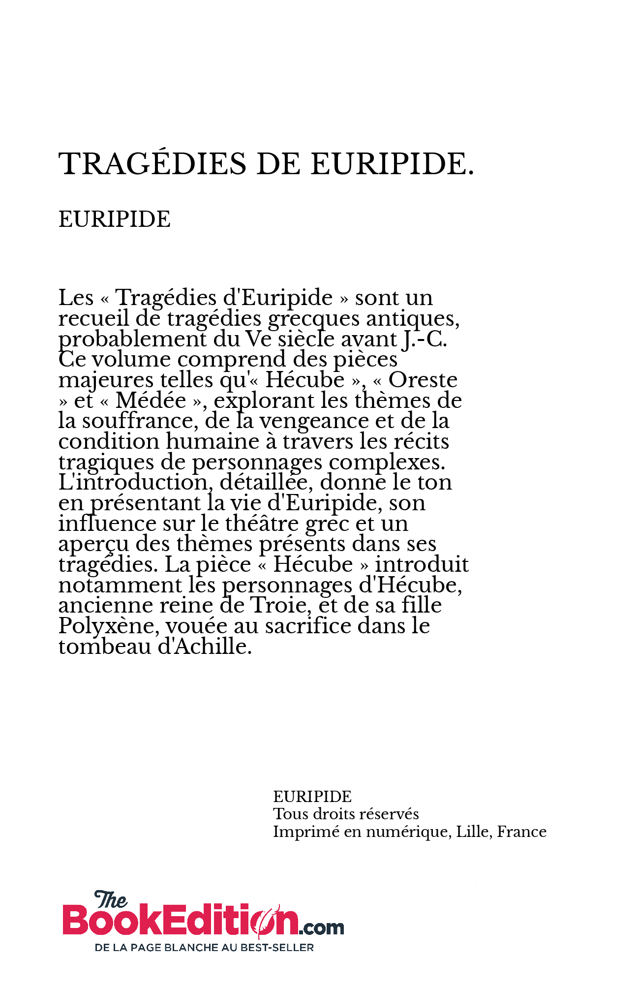 Les « Tragédies d'Euripide » sont un recueil de tragédies grecques antiques, probablement du Ve siècle avant J.-C. Ce volume comprend des pièces majeures telles qu'« Hécube », « Oreste » et « Médée », explorant les thèmes de la souffrance, de la vengeance et de la condition humaine à travers les récits tragiques de personnages complexes. L'introduction, détaillée, donne le ton en présentant la vie d'Euripide, son influence sur le théâtre grec et un aperçu des thèmes présents dans ses tragédies. La pièce « Hécube » introduit notamment les personnages d'Hécube, ancienne reine de Troie, et de sa fille Polyxène, vouée au sacrifice dans le tombeau d'Achille.