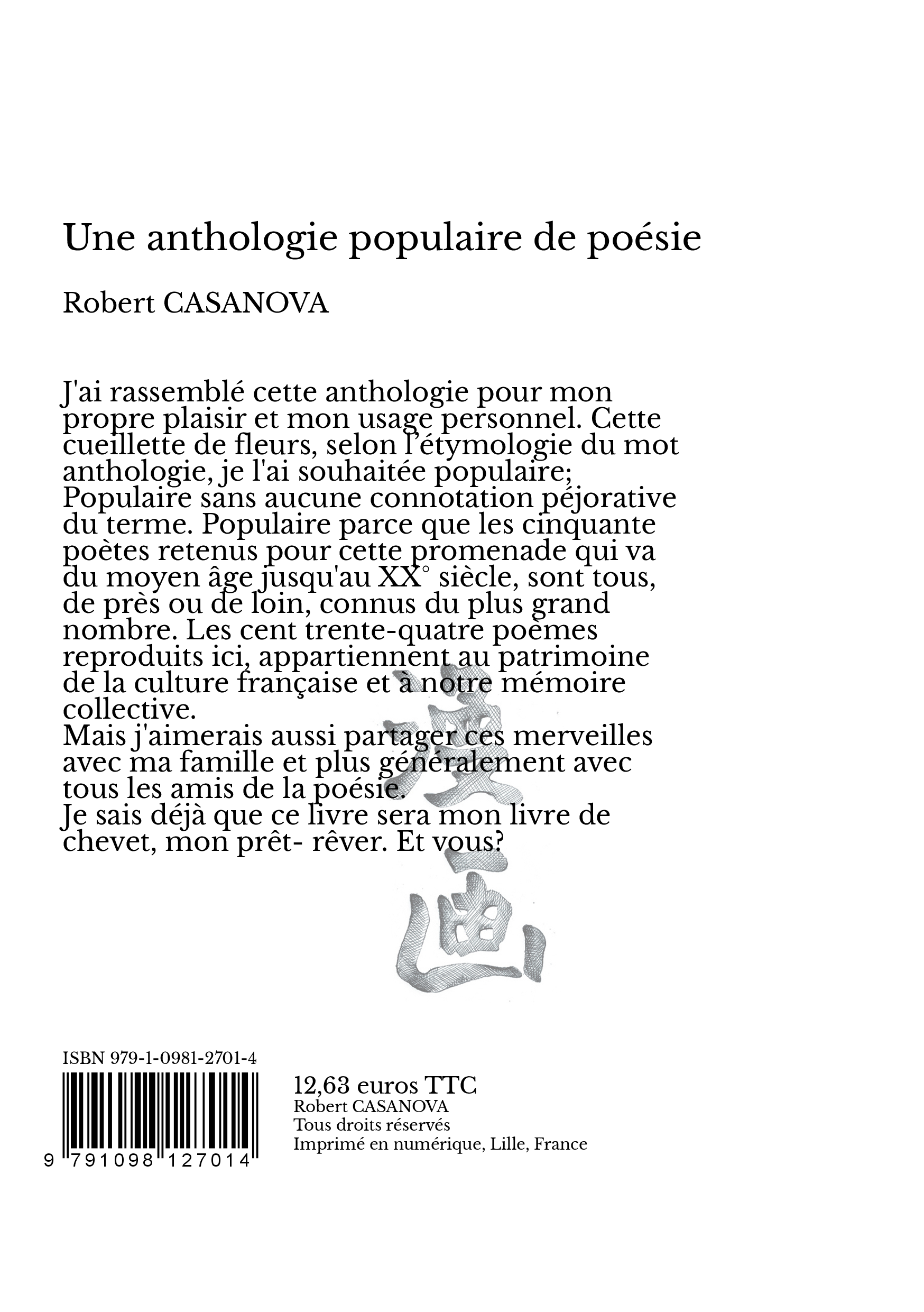 J'ai rassemblé cette anthologie pour mon propre plaisir et mon usage personnel. Cette cueillette de fleurs, selon l’étymologie du mot anthologie, je l'ai souhaitée populaire; Populaire sans aucune connotation péjorative du terme. Populaire parce que les cinquante poètes retenus pour cette promenade qui va du moyen âge jusqu'au XX° siècle, sont tous, de près ou de loin, connus du plus grand nombre. Les cent trente-quatre poèmes reproduits ici, appartiennent au patrimoine de la culture française et à notre mémoire collective.