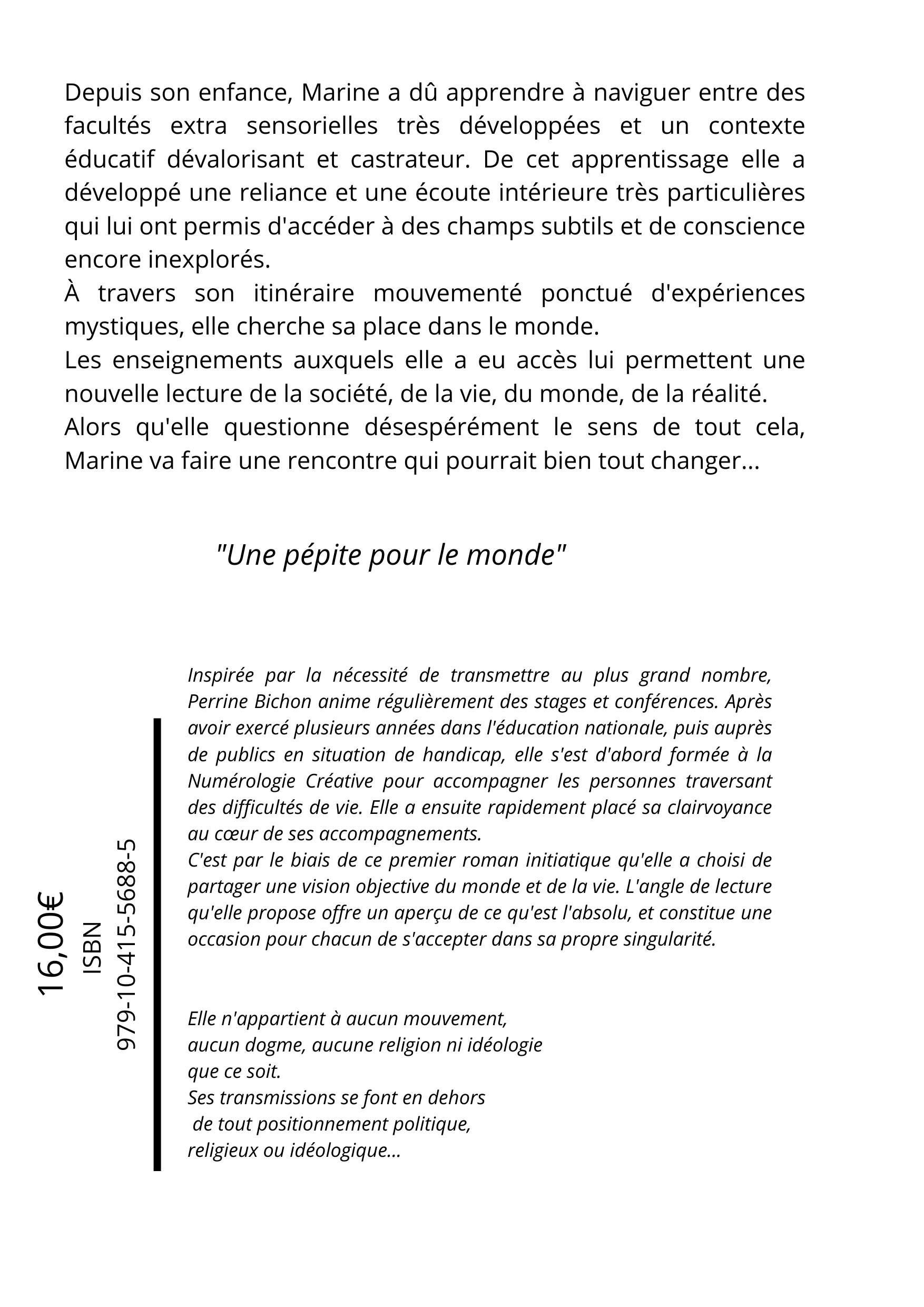 Depuis son enfance, Marine a dû apprendre à naviguer entre des facultés extrasensorielles très développées et un contexte éducatif dévalorisant et castrateur. De cet apprentissage elle a développé une reliance et une écoute intérieure très particulières qui lui ont permis d'accéder à des champs subtils et de conscience encore inexplorés. À travers son itinéraire mouvementé ponctué d'expériences mystiques, elle cherche sa place dans le monde.