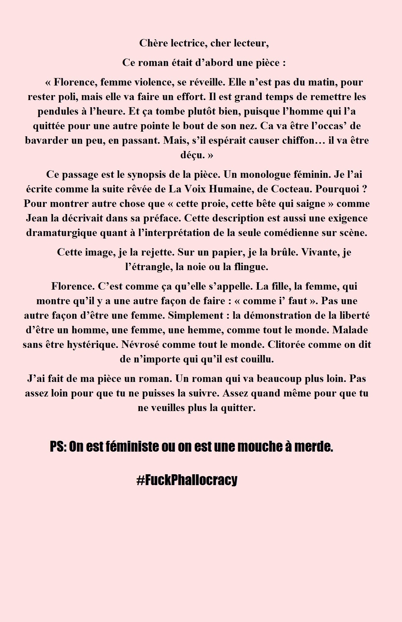 Pour toutes celles qui viennent de se faire larguer par des connards, pour toutes celles qui ont été trompées, humiliées, celles qui viennent de se réveiller ou ont besoin de le faire.. Avis aux nazes : la légende dit que si vous nana lit Anna Karénine, c'est qu'elle va vous tromper ; si elle lit Florence, je vous conseille de changer d'identité.