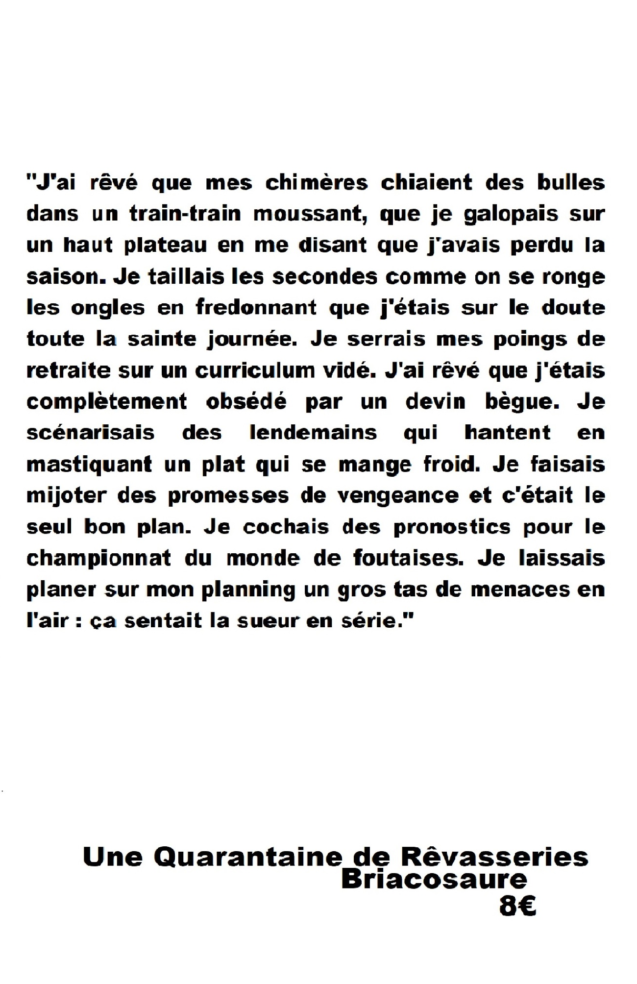 "J’ai rêvé que mes chimères chiaient des bulles dans un train-train moussant, que je galopais sur un haut plateau en me disant que j’avais perdu la saison. Je taillais les secondes comme on se ronge les ongles en fredonnant que j’étais sur le doute toute la sainte journée. Je serrais mes poings de retraite sur un curriculum vidé."