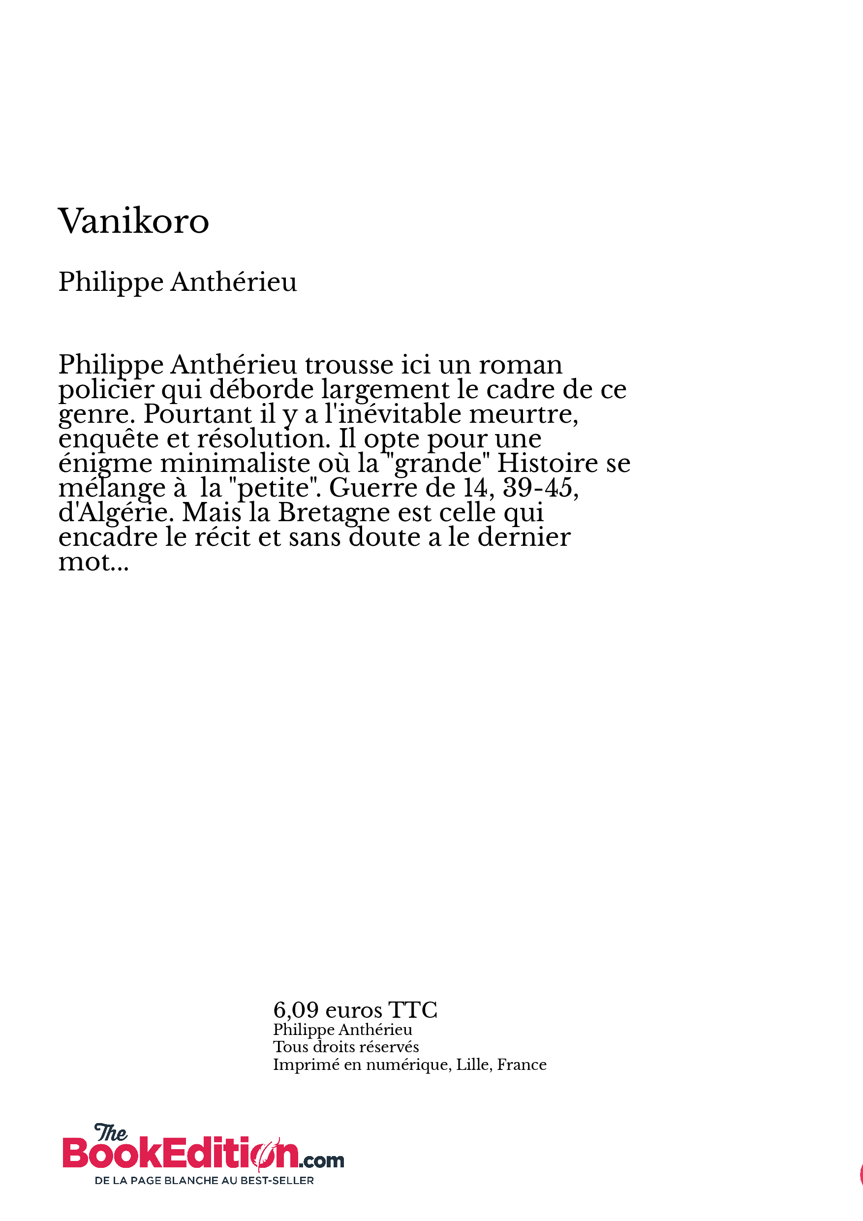 Philippe Anthérieu trousse ici un roman policier qui déborde largement le cadre de ce genre. Pourtant il y a l'inévitable meurtre, enquête et résolution. Il opte pour une énigme minimaliste où la "grande" Histoire se mélange la "petite". Guerre de 14, 39-45, d'Algérie. Mais la Bretagne est celle qui encadre le récit et sans doute a le dernier mot...