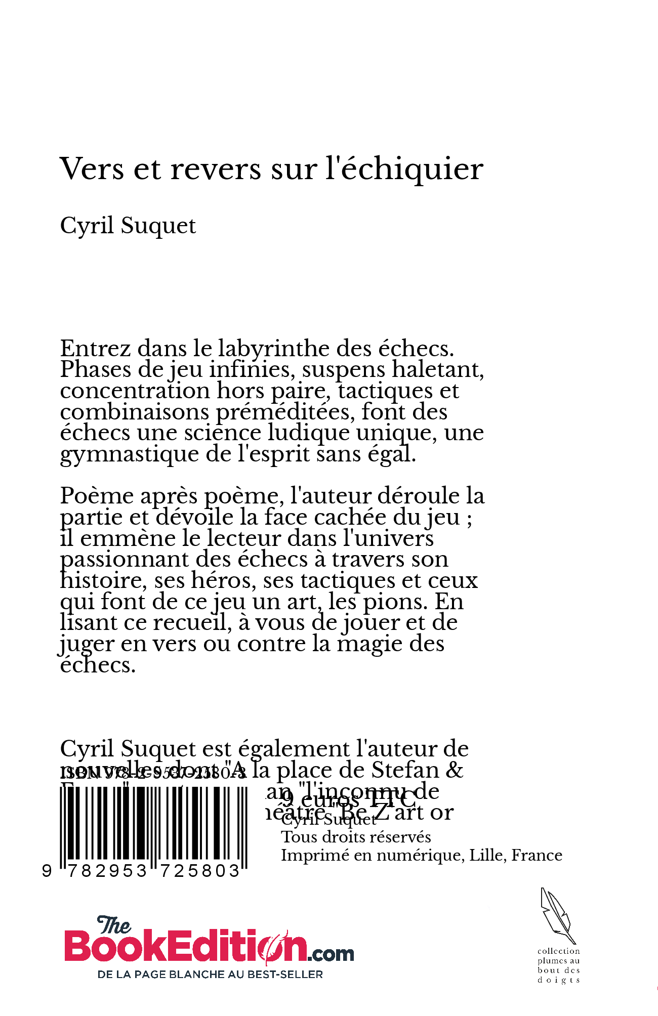 Poème après poème, l'auteur déroule la partie et dévoile la face cachée du jeu ; il emmène le lecteur dans l'univers passionnant des échecs à travers son histoire, ses héros, ses tactiques et ceux qui font de ce jeu un art, les pions. En lisant ce recueil, à vous de jouer et de juger en vers ou contre la magie des échecs.