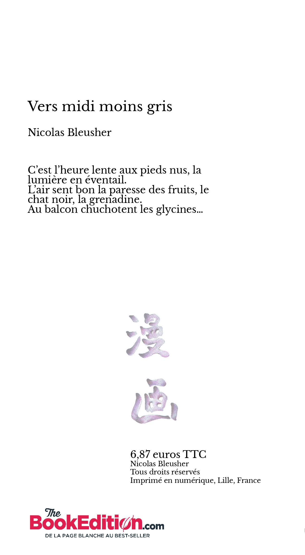 Vers midi moins gris est composé de 90 textes courts. Il est suivi de Les saisons du Palais, déambulations dans les jardins du Palais-Royal, à Paris, et de quelques bribes et autres haïkus regroupés dans la plaquette Les mots nuages. Ecriture minutieuse, retenue, délicatesse d’observation, notations sur le vif, confidences, introspection. Parmi les thèmes récurrents : la chambre, la mer, le soir, l’endormissement, le désir, la couleur, l’ennui, l’incapacité…