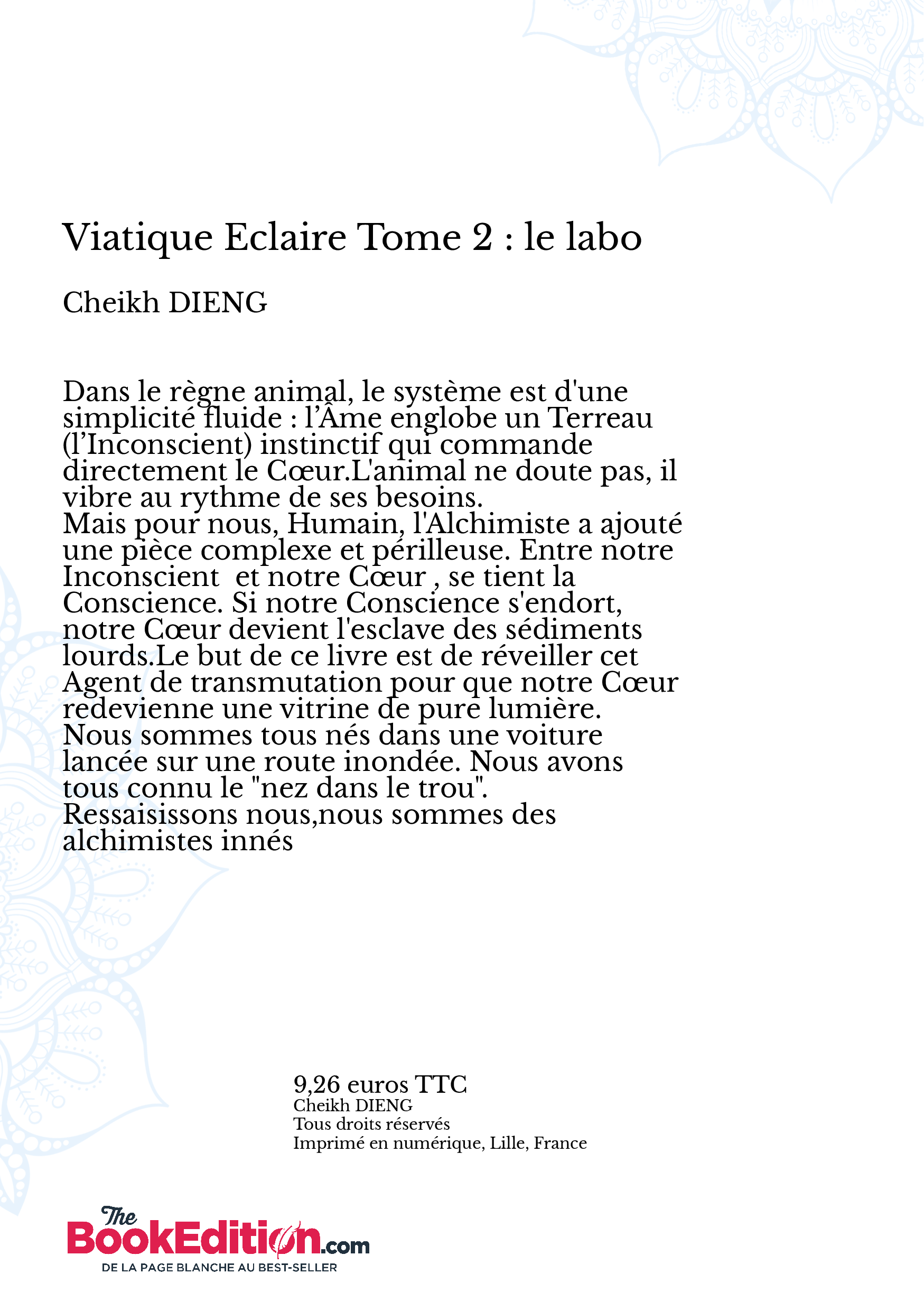 Mais pour nous, Humain, l'Alchimiste a ajouté une pièce complexe et périlleuse. Entre notre Inconscient et notre Cœur , se tient la Conscience. Si notre Conscience s'endort, notre Cœur devient l'esclave des sédiments lourds.Le but de ce livre est de réveiller cet Agent de transmutation pour que notre Cœur redevienne une vitrine de pure lumière.