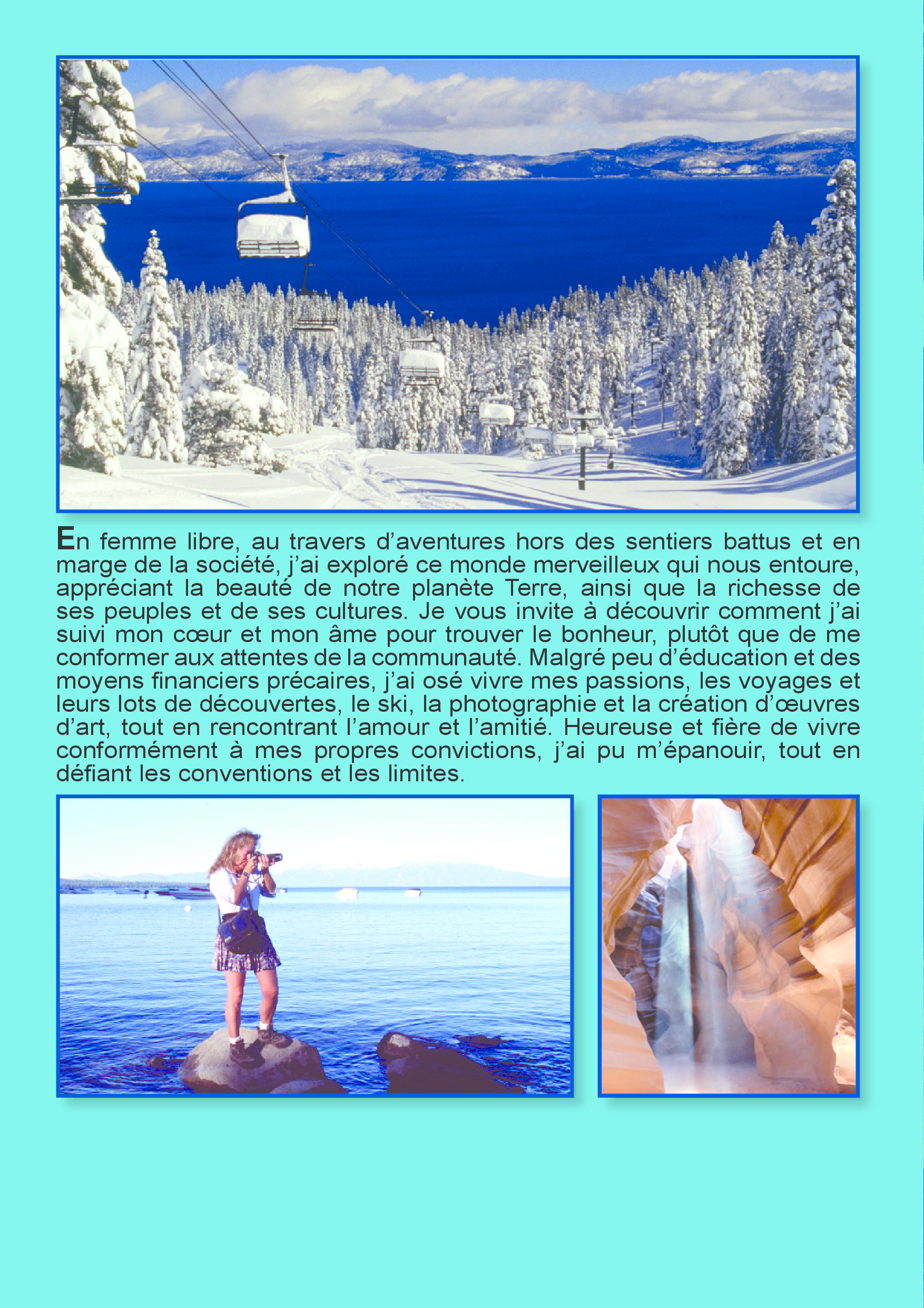 En femme libre, au travers d'aventures hors des sentiers battus et en marge de la société, j'ai exploré ce monde merveilleux qui nous entoure, appréciant la beauté de notre planète Terre, ainsi que la richesse de ses peuples et de ses cultures. Je vous invite à découvrir comment j'ai suivi mon cœur et mon âme pour trouver le bonheur, plutôt que de me conformer aux attentes de la communauté. Malgré peu d'éducation et des moyens financiers précaires, j'ai osé vivre mes passions, les voyages et leurs lots de découvertes, le ski, la photographie et la création d’œuvres d'art. Heureuse et fière de vivre conformément à mes propres convictions, j'ai pu m’épanouir, tout en défiant les conventions et les limites.
