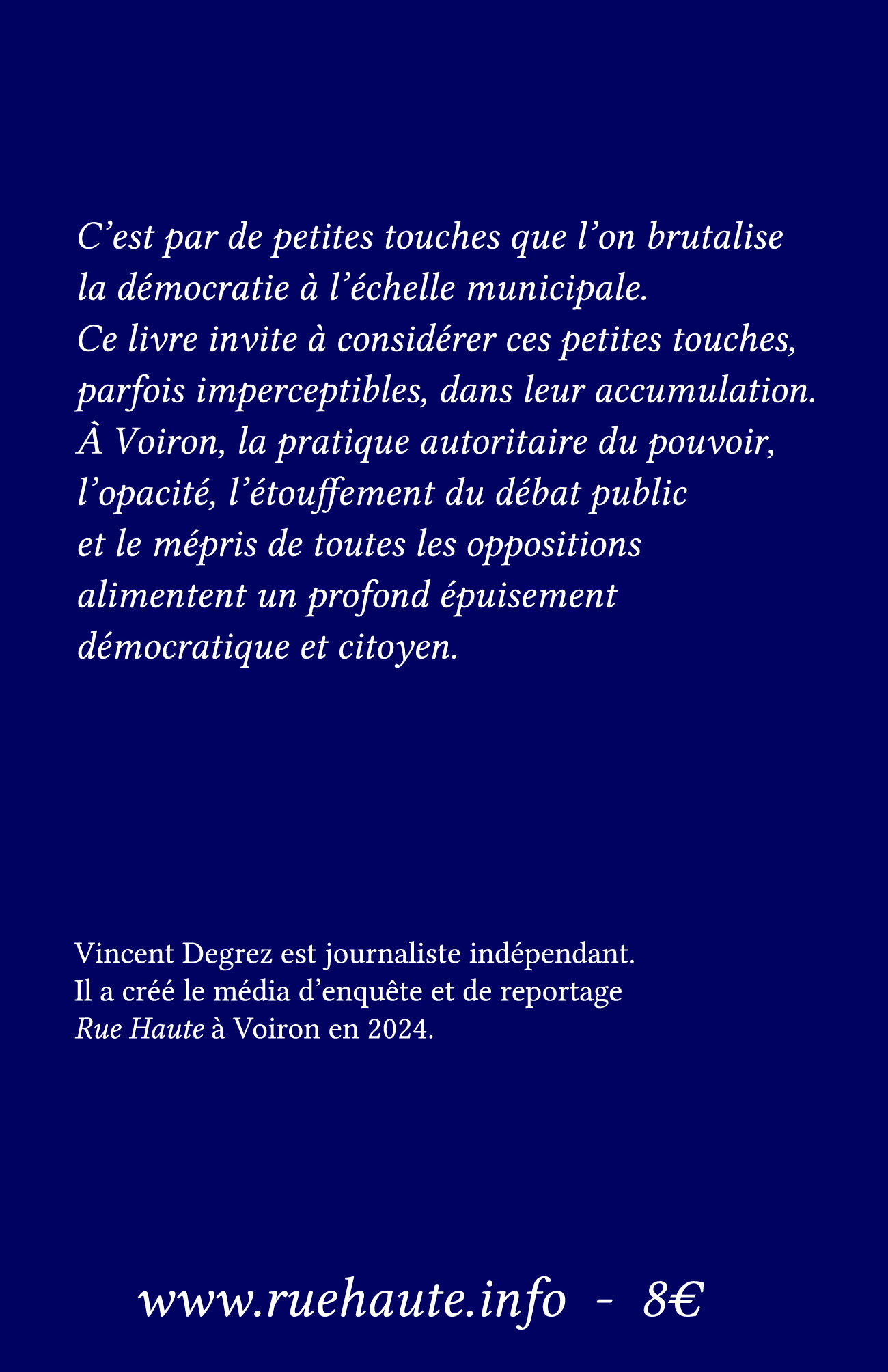 C’est par de petites touches que l’on brutalise la démocratie à l’échelle municipale. Ce livre invite à considérer ces petites touches, parfois imperceptibles, dans leur accumulation. À Voiron, la pratique autoritaire du pouvoir, l’opacité, l’étouffement du débat public et le mépris de toutes les oppositions alimentent un profond épuisement démocratique et citoyen.