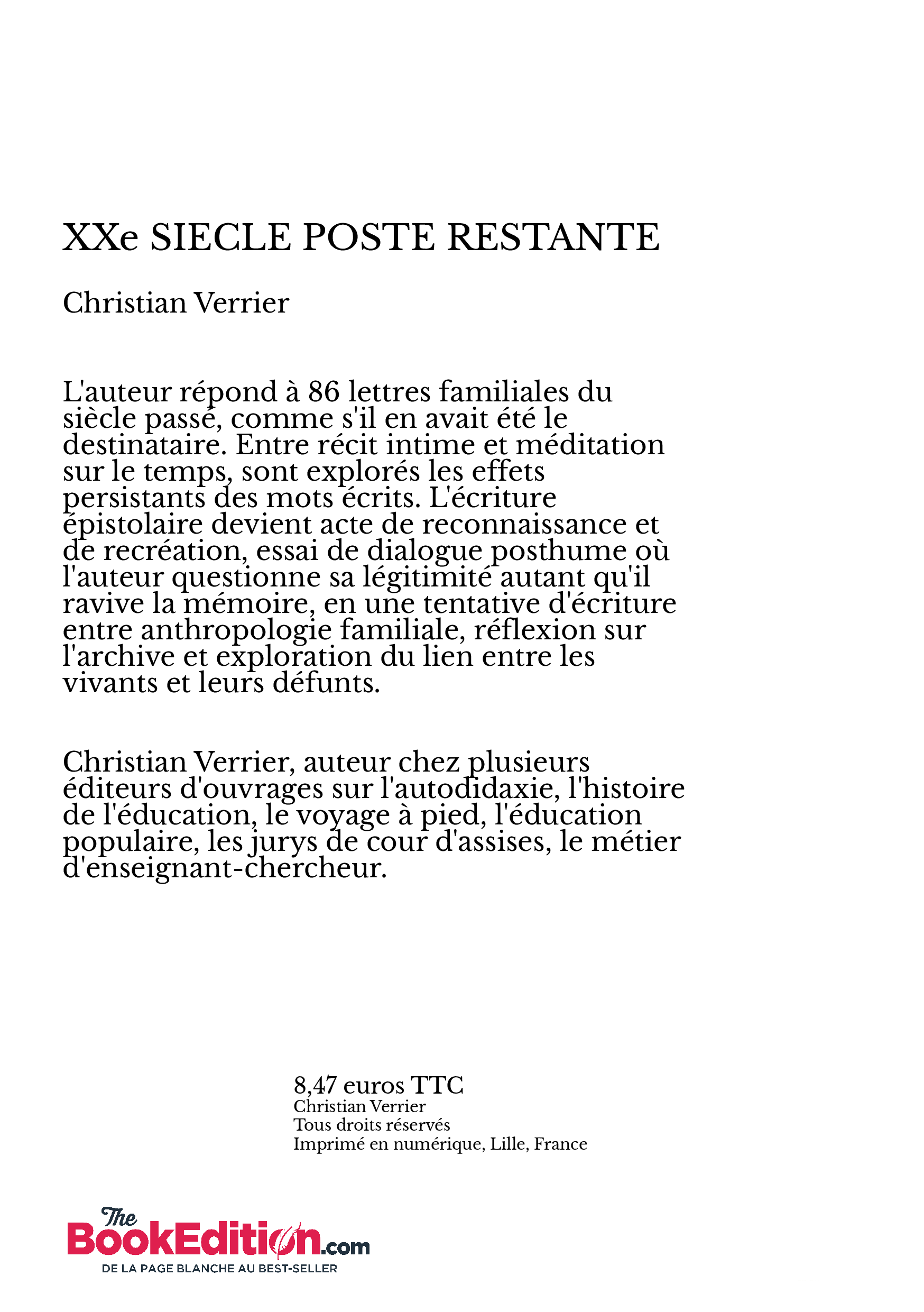 Christian Verrier, auteur chez plusieurs éditeurs d'ouvrages sur l'autodidaxie, l'histoire de l'éducation, le voyage à pied, l'éducation populaire, les jurys de cour d'assises, le métier d'enseignant-chercheur.